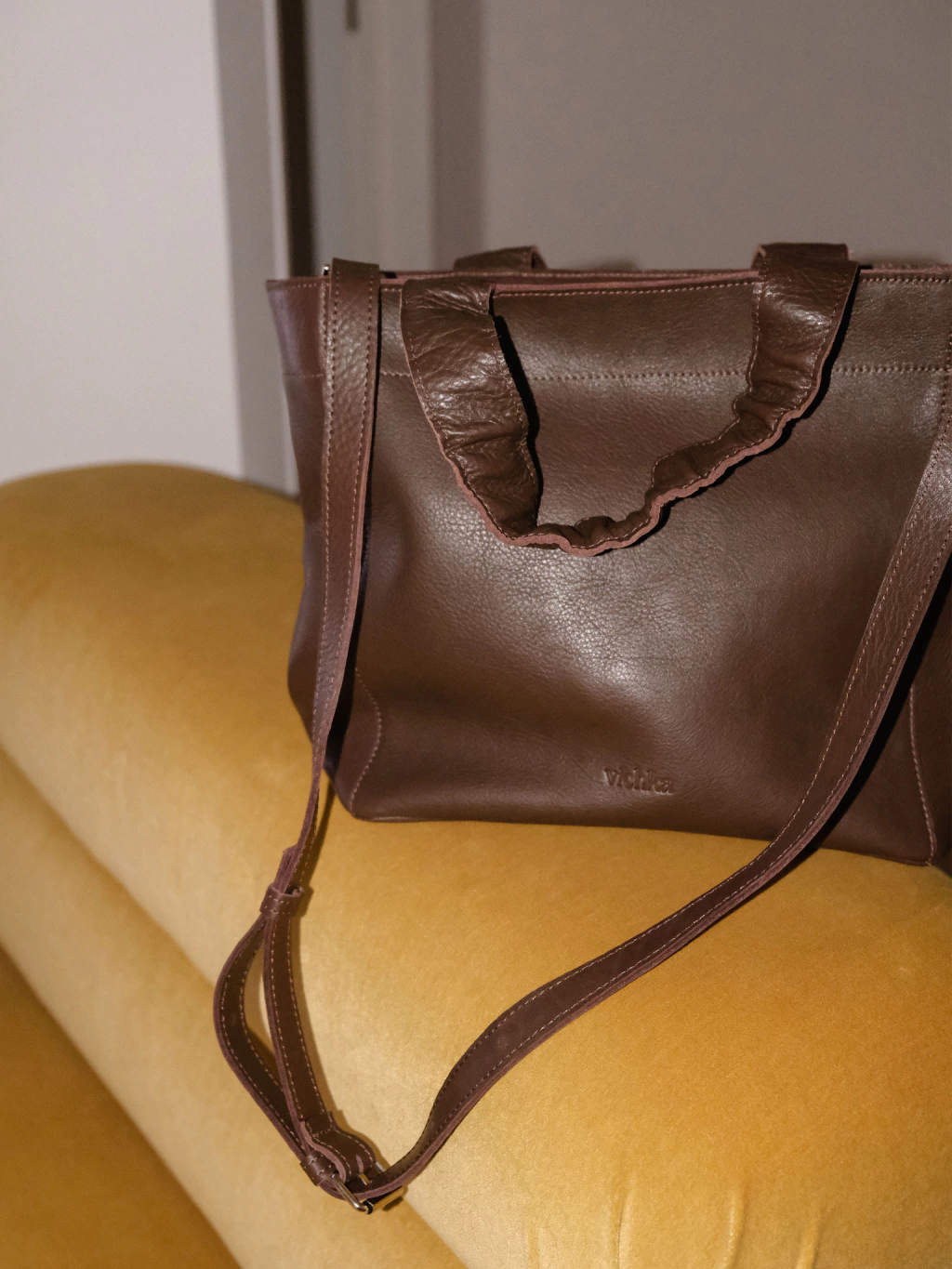 Hecha con cuero real, Agatha es esa aliada que no te abandona en la mitad del día, se adapta a tu ritmo, con manija de mano firme para llevarla con presencia. Y sí, también se transforma en bandolera cuando necesitás manos libres. Básicamente, una cartera que piensa.